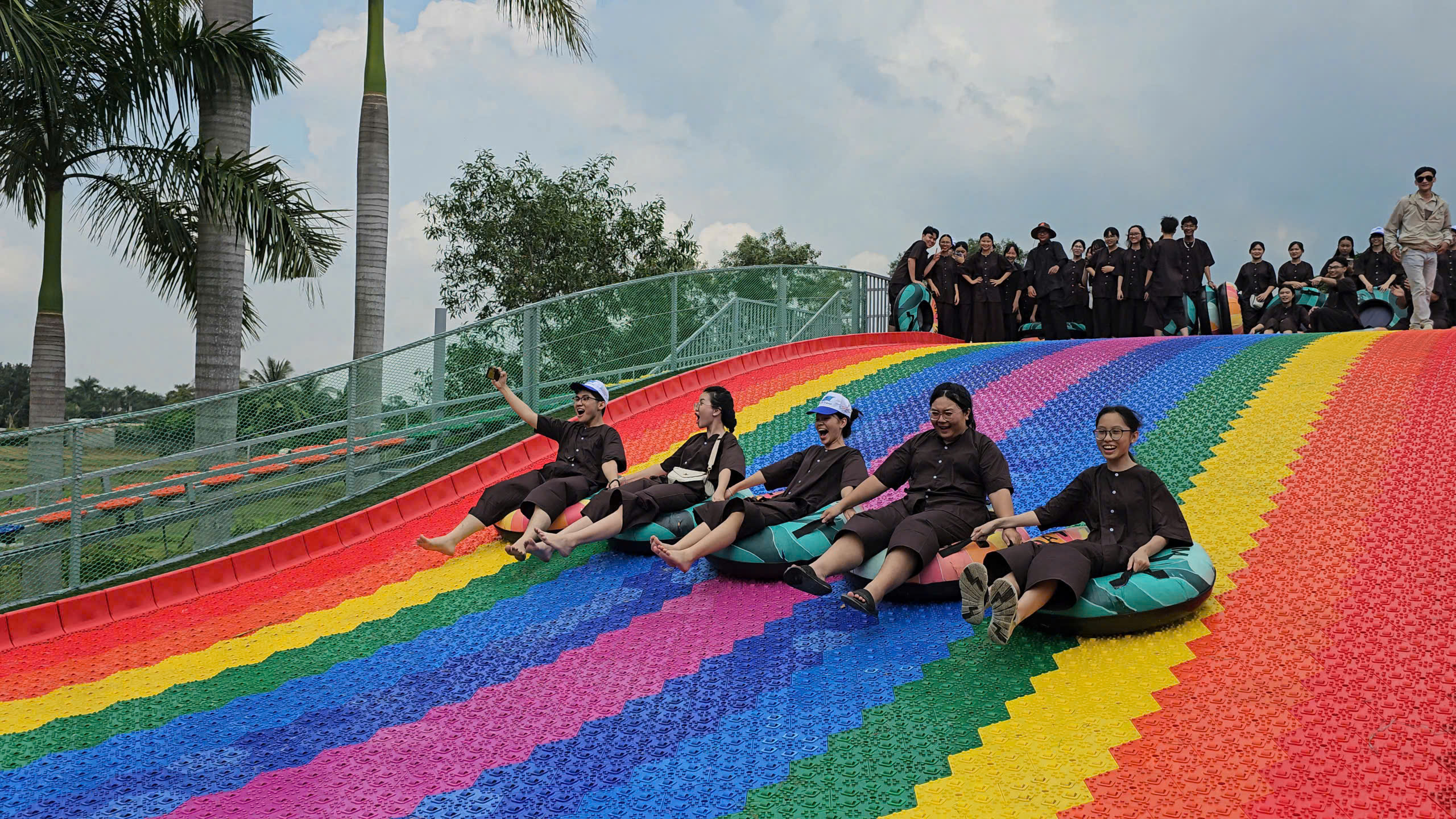 Một tọa độ sống ảo rực rỡ sắc màu và mang lại cảm giác tốc độ đầy sảng khoái cho những ai thích mạo hiểm. Đường trượt phao khô tại trang trại được thiết kế uốn lượn với thảm cỏ nhân tạo đa sắc, cho phép bạn ngồi trên những chiếc phao tròn và lao đi giữa không trung. Cảm giác gió lướt qua tai và sự phấn khích khi lao từ trên cao xuống sẽ khiến bạn muốn trải nghiệm mãi không thôi. Đây không chỉ là trò chơi giải trí vui nhộn mà còn là góc check-in lung linh giúp bạn lưu lại những khoảnh khắc rạng rỡ nhất trong chuyến đi.